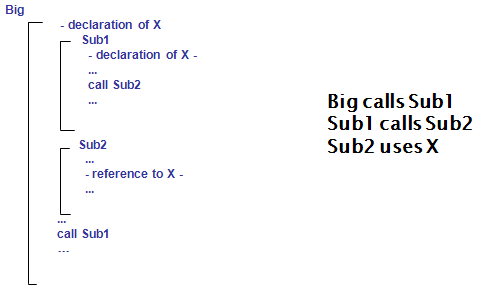 Example 1. If big call sub2 and sub2 call sub1, then x in sub1 is referenced in the declaration of sub2.procedure big;