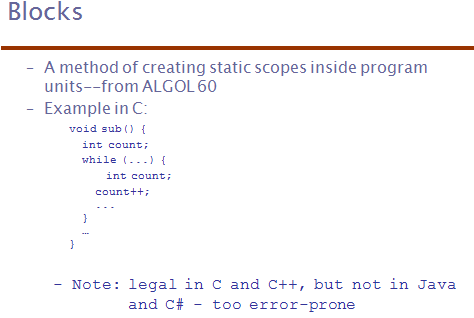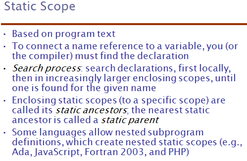 Read Section 5.8.3 and figures 5.1, 5.2, 5.3 and 5.4 to see some problems with static scope.