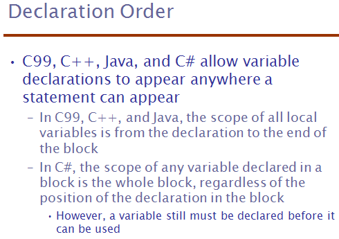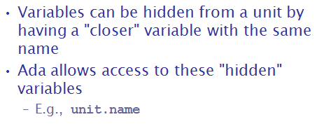 follow execution path (The scope is determined on run time.)First, find from the current subprogram. (local declarations)