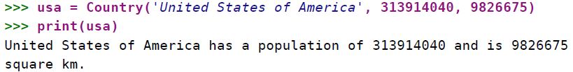 canada = Country('Canada', 34482779, 9984670) usa = Country('United States of America', 313914040, 9826675)